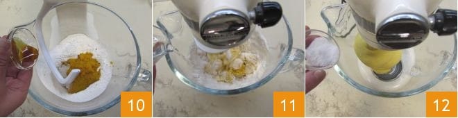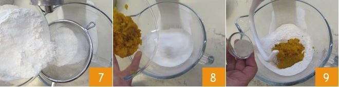 In a stand mixer, sift the flour 7 then add the pumpkin puree 8, yeast 9