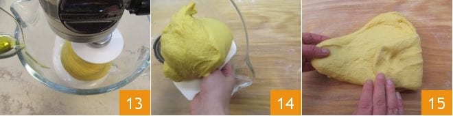 Let the salt absorb while continuing to knead for 2 minutes, then add the oil in a slow stream 13 and let it absorb as well: it will take about 3 minutes. Transfer the dough to the work surface 14, stretch it slightly and proceed with the folds: fold the side flaps 15