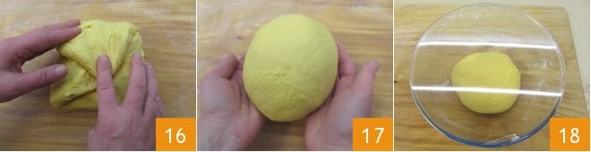 And then the top and bottom flaps, as if making a bundle 16. Seal to form a ball 17 and place it to rise inside a large bowl. Cover with plastic wrap 18