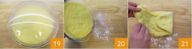 and let the dough rise for at least 3 hours in a warm place (for example, the oven turned off with the light on) until it doubles in volume 19. Lightly flour the work surface and place the risen dough on it 20. Repeat the 4 strength folds 21,