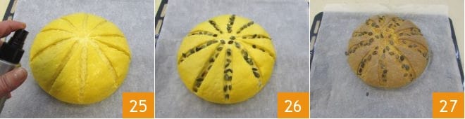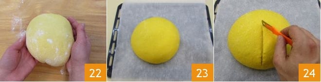 form a well-sealed ball as before 22 and place it on a baking tray lined with parchment paper. Let it rise for another hour 23 then, with a sharp knife or cutter, make 8 cuts on the surface of the dough 24, to make it resemble a real pumpkin.