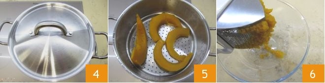cover with the lid 4. Cook the pumpkin: it will take about 30 minutes, and it should be soft yet firm 5 – you can check the consistency with a fork. Mash the cooked pulp with a potato masher 6 to obtain a puree.