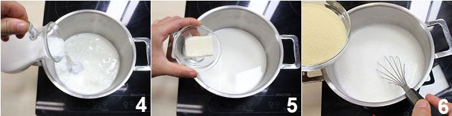 Move on to the gnocchi dough: put the milk in a saucepan 4 with 3 tbsp of butter of the total 1/3 cup 5 and turn on a moderate heat. Salt and add nutmeg, then when the milk reaches a simmer, slowly pour in the semolina, stirring vigorously with a whisk to avoid lumps 6. Lower the heat to prevent the bottom from burning. Cook everything while stirring with a whisk for 3-4 minutes, being careful to mix everything until a smooth mixture forms and the semolina has thickened.