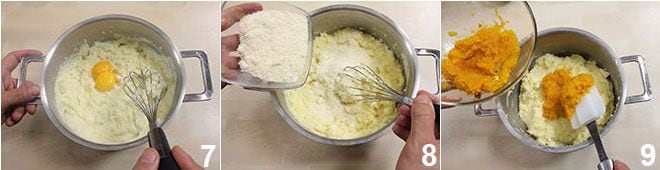 At this point, remove the saucepan from the heat and add the egg yolks 7 and 3 oz of Parmigiano Reggiano 8, and incorporate everything with a whisk. Finally, add the pumpkin puree 9 and blend everything together.