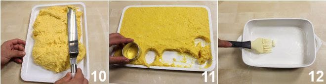 Transfer the mixture to a shallow, slightly dampened tray, and with the help of a spatula 10, spread the mixture to a thickness of 1/2 inch. Wait about 5 minutes for the gnocchi mixture to cool, and with the help of a 2-inch pastry cutter, cut out the pumpkin gnocchi 11. Butter a baking dish 12 and