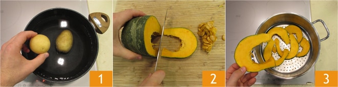 To prepare Pumpkin, Ricotta, and Speck Bites, start with the potatoes, place them in a pot filled with water 1, turn on the stove and, from the moment it boils, count about 30-40 minutes. In the meantime, remove the seeds from the pumpkin, cut into thin slices of about 1/2 inch (1 cm) thick 2, and place inside a steamer 3. Set it over the pot with the potatoes and cook for about 20-25 minutes: use a fork to test for doneness.