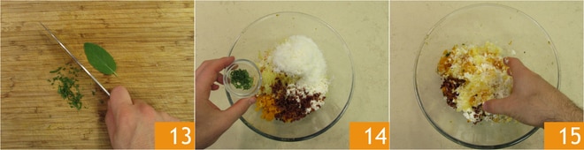 Also chop the sage with a knife 13, add it to the bowl 14 with salt, pepper, and ground cinnamon. Knead the mixture by hand 15, it will become compact but a bit soft.