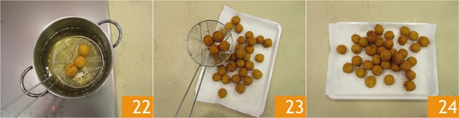 Drain 22 on absorbent paper 23 and continue with all the others. Your pumpkin, ricotta, and speck bites are ready 24 to be enjoyed hot, accompanied by Greek yogurt flavored with grated lime zest.