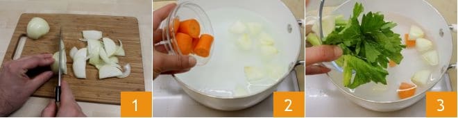 To prepare the pumpkin risotto with robiola and crispy bacon, start by making the Vegetable broth In a large pot, bring water to a boil; meanwhile, wash all the vegetables thoroughly. Peel an onion and chop it into pieces 1, then peel a carrot, removing the ends, and roughly chop it 2 along with the celery. Add all the vegetables 3, season with salt, and when the water reaches a boil, cover with a lid. Cook for about half an hour and, once done, strain the broth using a sieve.