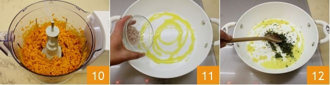Chop the pumpkin until very fine 10 and then prepare the sauté; in a large non-stick pot, sauté the finely chopped shallot with a drizzle of oil 11, add the aromatic herbs you prepared, and cook on very low heat for 15 minutes, adding a little broth 12.