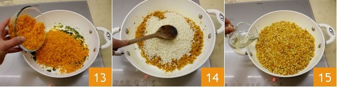 When the shallot is well browned, add the chopped pumpkin 13; season with salt to taste and add the rice 14, stirring well with a wooden spoon for a few minutes to prevent it from sticking to the pan. Toast the rice and deglaze with white wine 15.