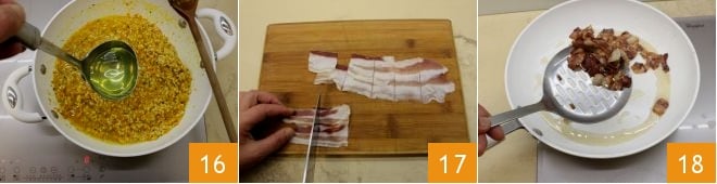 Let it cook for at least 20 minutes, and during cooking, add 1-2 ladles of vegetable broth each time the previous one has been absorbed 16. A few minutes before the risotto is done cooking, prepare the seasoning: cut the robiola into cubes and set aside, then take the bacon, cut it into thin strips and then into squares 17; sauté it over medium heat in a non-stick pan until crispy and golden 18.