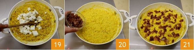When the risotto is ready, turn off the heat and cream by adding the cubed robiola 19; mix well and finish by adding the crispy bacon 20. Let it rest for two minutes and serve the pumpkin risotto with robiola and crispy bacon hot 21.