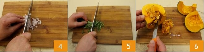 Meanwhile, finely chop the shallot 4, sage, and rosemary 5 and set aside. Now proceed to clean the pumpkin: with a knife, cut it in half and then into slices, then clean the inside, removing the seeds and fibers 6.