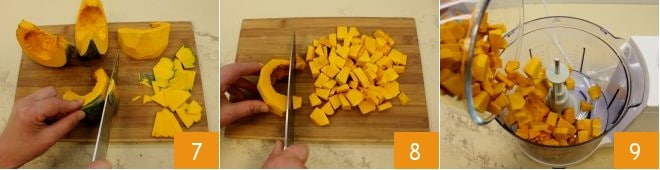 After removing the peel 7, cut the flesh into cubes about 3/4 inch (2 cm) 8 and place the pumpkin cubes in a blender 9.