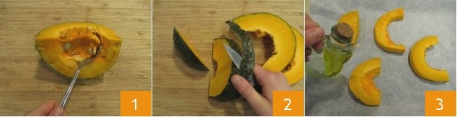 To make the pumpkin scones, start by preparing the pumpkin: cut it into slices, remove the seeds and inner fibers with a spoon 1, then peel it 2. Arrange the pumpkin slices on a baking sheet lined with parchment paper and season with oil 3,