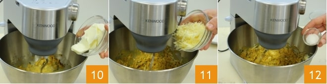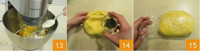 finally, the sifted flour and baking powder 13. Activate the stand mixer for a few moments to mix and incorporate all the ingredients, then place the dough on the work surface and add the chopped thyme 14. Work the dough by hand until you get a compact and homogeneous dough, then wrap it in plastic wrap 15 and place it in the refrigerator to firm up for at least half an hour.