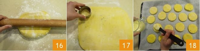 After the resting time, place the dough on a lightly floured surface and roll it out with a rolling pin to obtain a sheet about 0.6 inches thick 16. Use a 2.5-inch diameter pastry cutter to cut out circles 17, then knead the leftover scraps to make more circles: with these amounts, you should get about 24. Transfer the circles to a baking sheet lined with parchment paper, beat the egg with a tablespoon of milk and brush the surface with this emulsion 18.