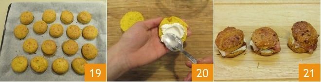 Bake the scones in a preheated static oven at 392°F for 10-15 minutes, until they are lightly golden on the surface 19. Once cooked, remove them from the oven and transfer them to a rack to cool. At this point, you can enjoy them on their own or cut them in half and fill with cream cheese 20 and culatello, as we did, or with other cold cuts and cheeses of your choice. The pumpkin scones are ready to be served 21!