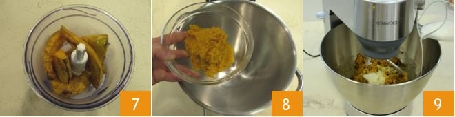 Once cooked, remove the pumpkin from the oven and let it cool. Once cooled, transfer it to a blender 7 and puree it. Transfer the pumpkin puree to the bowl of a stand mixer fitted with a dough hook 8 and add the rest of the ingredients: milk 9,