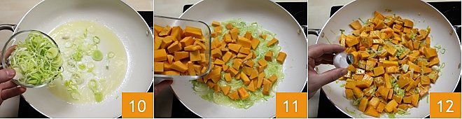 Next, in a large, shallow pot, melt the butter and add the leeks 10, let them soften for a couple of minutes, and then add the pumpkin 11. Salt and pepper and cook for about ten minutes 12,