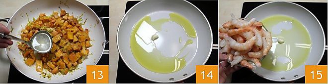 gradually adding the filtered shellfish stock 13. In another non-stick pan, heat the oil with the other garlic clove 14 and quickly sauté the previously cleaned shrimp 15
