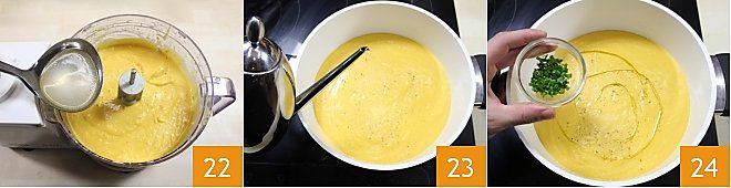 add a ladle of stock if you want a creamier consistency that is not too liquid 22. Put the soup back in the pot, adjust with salt and pepper if needed, add a drizzle of oil 23, and add the chopped chives 24. Your warm pumpkin soup with shrimp is ready! Garnish with the remaining shrimp, sprinkle with finely chopped chives, and possibly a grind of pepper. Place the shrimp in the pan with a drizzle of oil and garlic, blend the soup with a bit of broth if necessary.