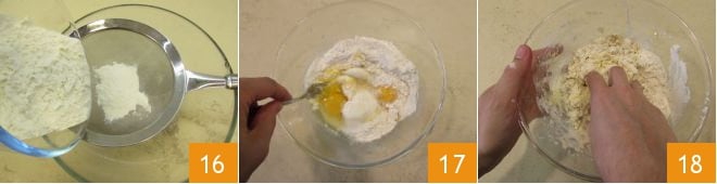 The next day, prepare the fresh pasta: sift the flour into a large bowl 16 or onto a pastry board, then add the room temperature eggs and quickly beat them with a fork 17 and combine the ingredients by hand until you obtain a soft, non-sticky dough 18. If it is still sticky (which may depend on the absorption rate of the flour used), add a little more flour sparingly; if, on the contrary, the dough is dry, you can moisten it by adding a little room temperature water. It is also important to respect the egg dosage as indicated to achieve the perfect egg pasta consistency.
