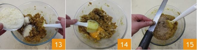 and also add the grated cheese 13, blend well and add the egg 14. Once absorbed into the filling, salt to taste and season with nutmeg 15. Cover with plastic wrap and refrigerate overnight, or better yet, for 24 hours.