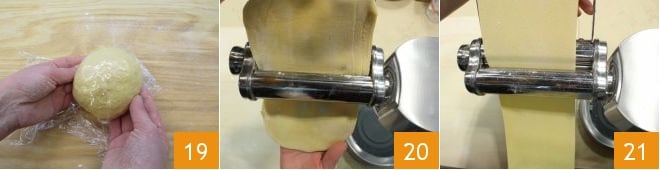 Shape the dough into a ball 19 and wrap it in plastic wrap. Let it rest at room temperature in a cool place for at least 30 minutes. After the necessary time has passed, retrieve the dough and divide it into at least two parts (as you work it, keep the unworked dough covered with plastic wrap); use a pasta machine or a rolling pin to roll each piece of dough until you get rectangles about 0.08 inches thick (20-21).
