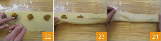 Lay the rolled pasta on a lightly floured work surface, trim the sheet with a pasta cutter to obtain a strip 3.5 inches wide, and place small mounds of filling (about 0.5 oz) on the top part of the strip (leaving at least 0.4 inches from the edge), spacing the mounds a few inches apart along the entire strip of fresh pasta 22. Fold the fresh pasta strip to cover the filling (23-24): if the sheet is a bit dry, you can lightly brush it with a little water.