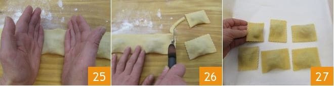 Press between the spaces of the filling mounds to adhere the pasta edges 25, before cutting the tortelli with a fluted pasta cutter 26: the shape and size of the tortelli may vary according to taste and tradition. We made rectangles 1.8x2.4 inches. As you make the tortelli, place them on a tray lined with a lightly floured dry kitchen cloth or paper 27. Continue this way until all the fresh pasta and filling are used: you will end up with about 40 tortelli.