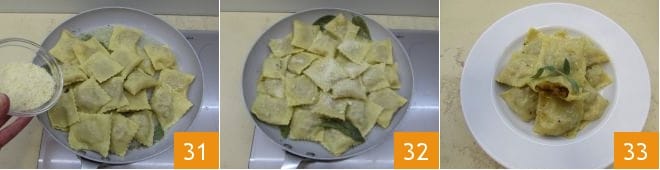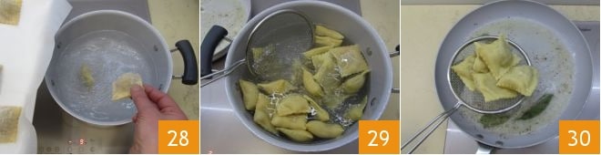 Then place a large pot with salted water on the stove. Prepare the seasoning by melting butter in a very large pan with sage, lightly salt it, and turn off the heat when completely melted, being careful not to burn it. When the water is boiling, drop in the pumpkin tortelli to cook them 28: it will take 3-4 minutes. Then drain them with a slotted spoon 29 directly into the pan with the now melted butter and sage 30.