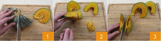 To prepare the pumpkin tortelli, start with the filling, which should rest in the refrigerator for at least overnight or preferably for 24 hours to let the flavors blend. Take the pumpkin and cut it into pieces 1 to more easily remove the seeds and inner fibers 2. Then slice it 3