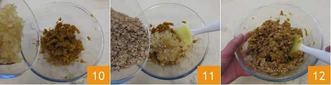 Then add the mustard 10 and the crumbled amaretti to the pumpkin 11, mix with a spatula 12