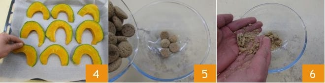 and place the slices on a baking sheet lined with parchment paper 4: bake in a preheated static oven at 428°F for about 20 minutes (or in a fan oven at 392°F for about 10 minutes). Check the cooking from time to time by piercing the pulp with the tines of a fork: the pumpkin should be soft but not burnt. While the pumpkin cooks, crumble the amaretti in a bowl using your hands (5-6).