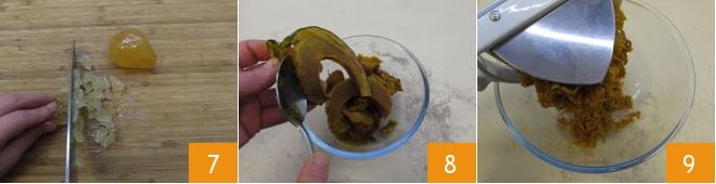 Chop the Mantuan mustard of pears (or quinces) with a knife 7. You can also use a grinder if you prefer a finer result. Once the pumpkin is cooked, let it cool in the turned-off oven so it dries and loses as much water as possible. Then scoop out the cooked pulp using a melon baller or spoon 8 and pass it through a potato masher 9, collecting it in a small bowl.