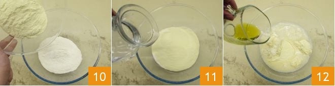 Now prepare the dough for the culurgiones: in a bowl, pour the flour, semolina 10, room temperature water 11, salt, and oil 12.