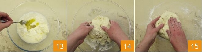 Mix the mixture first with a fork 13 and then for a few minutes by hand 14, transferring to the work surface for convenience 15. You should obtain a smooth and elastic dough.