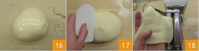 Form a ball, cover with plastic wrap 16, and let it rest at room temperature for half an hour. After this time, prepare the culurgiones: take the dough ball and take a small portion (keep the rest covered in plastic wrap so it doesn't dry out) 17, roll out the dough, after lightly dusting it with semolina, using the pasta roller to thickness no. 7 18.