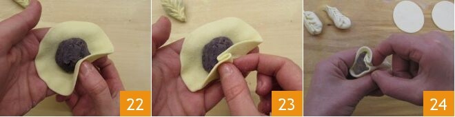 Take the disc and fold one edge of the dough over the filling 22. Now pinch the dough on the side of the edge and drag it over the folded edge 23 (the dough is elastic, so you can pull it gently without tearing it), and immediately repeat the operation on the other side 24.