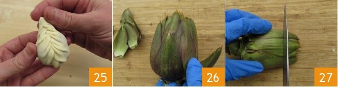 Continue bringing each pinch of dough alternately towards the center to form a sort of braid. Once at the top, seal the tuft, and your first culurgione is ready 25. Continue in this way, you should obtain about 30 pieces. Once the culurgiones are finished, prepare the dressing: clean the artichokes by removing the harder outer leaves 26 and cutting off the tips 27.
