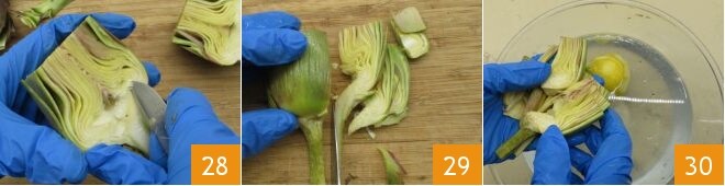 Then cut them in half and extract the central choke 28, now you can cut them into thin slices 29 and store them in acidified water with lemon 30 as you slice them.