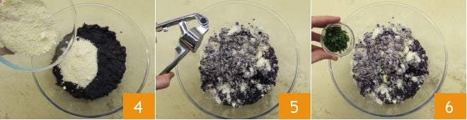 then add the Pecorino cheese 4, a clove of pressed garlic 5, some chopped fresh mint leaves 6,