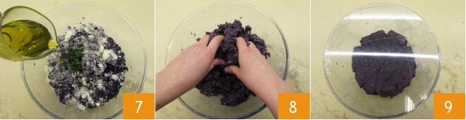 olive oil 7, salt, and pepper. Mix well by kneading by hand 8, cover with plastic wrap 9, and refrigerate to firm up for at least 1 hour.