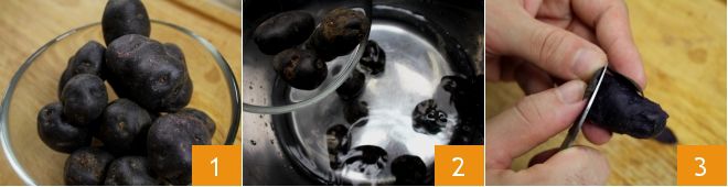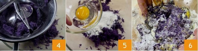 To make the purple potato gnocchi, take the purple potatoes 1, wash them thoroughly, and boil them in salted water to taste 2: it will take about 30-40 minutes (time will be halved if you use a pressure cooker). Once cooked, drain and peel them while still hot 3.