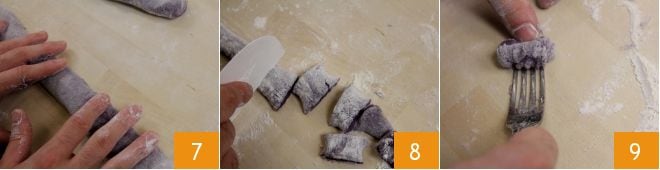 With the dough obtained, form small logs 7 which you will need to cut into bite-sized pieces 8. Pass the gnocchi over the tines of a fork 9 or on a gnocchi board to create the characteristic ridges.