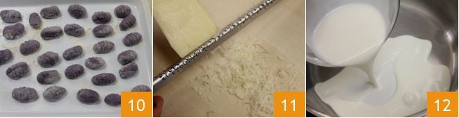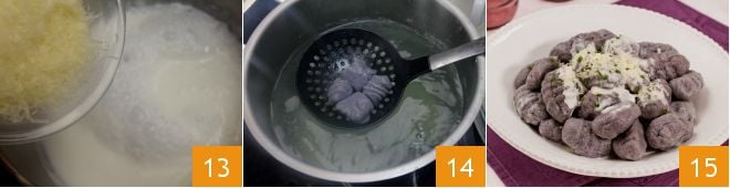 add the grated Gruyère 13. Mix well to melt it, then adjust with salt, pepper, and grate nutmeg to flavor. While the cream thickens over low heat, cook the gnocchi in a large pot: it will only take a few moments and the gnocchi will be ready when they float to the surface. Then drain them with a slotted spoon 14 and dress them with the Gruyère cream! Serve the purple potato gnocchi hot 15!