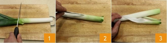 To prepare the quiche with scallops and leeks, start by cleaning the leeks. Remove the green part 1, then cut the surface with the blade of a small knife 2, remove the outer layer 3, and finally cut them into thin slices 4.
