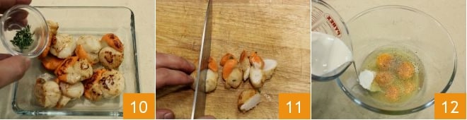Once cooked, let the mollusks cool in a bowl and flavor them by adding some thyme 10. After coarsely chopping the scallops 11, set them aside. In a bowl, pour the four eggs and the yolk, salt, pepper, and fresh cream 12.